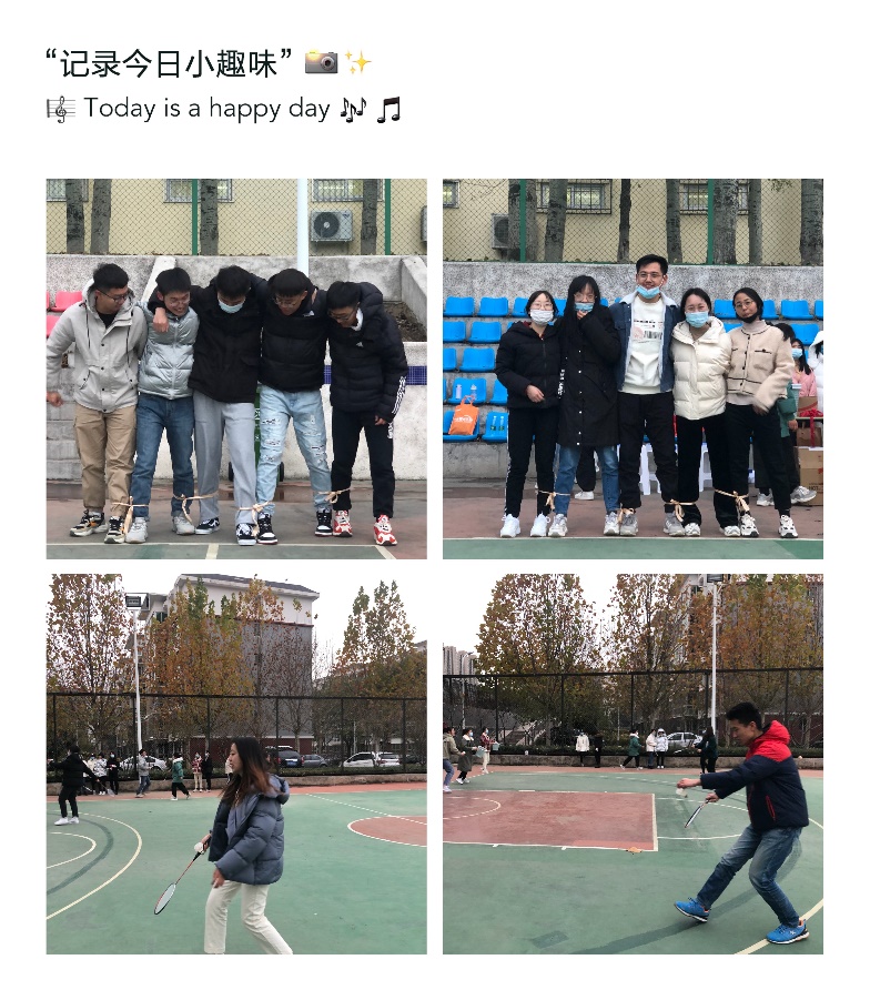 经过同学们的热场,接下来就进入羽毛球颠球和五人六足的比赛过程中了。其中,羽毛球颠球要求三人一组,限时分钟,第一名队员用羽毛球拍颠球至2号点位,第二名队员在2号点位用羽毛球拍将球击出,第三名队员在3号点位用筐接住,每组进球多者获胜。而四人五足要求参赛队员脚并脚扣紧绳子,肩搭肩,齐步跑起来,同学们齐心协力,不甘落后,团结协作,奋力向终点冲刺,在比赛的过程中,掌声、笑声、喝彩声此起彼伏。