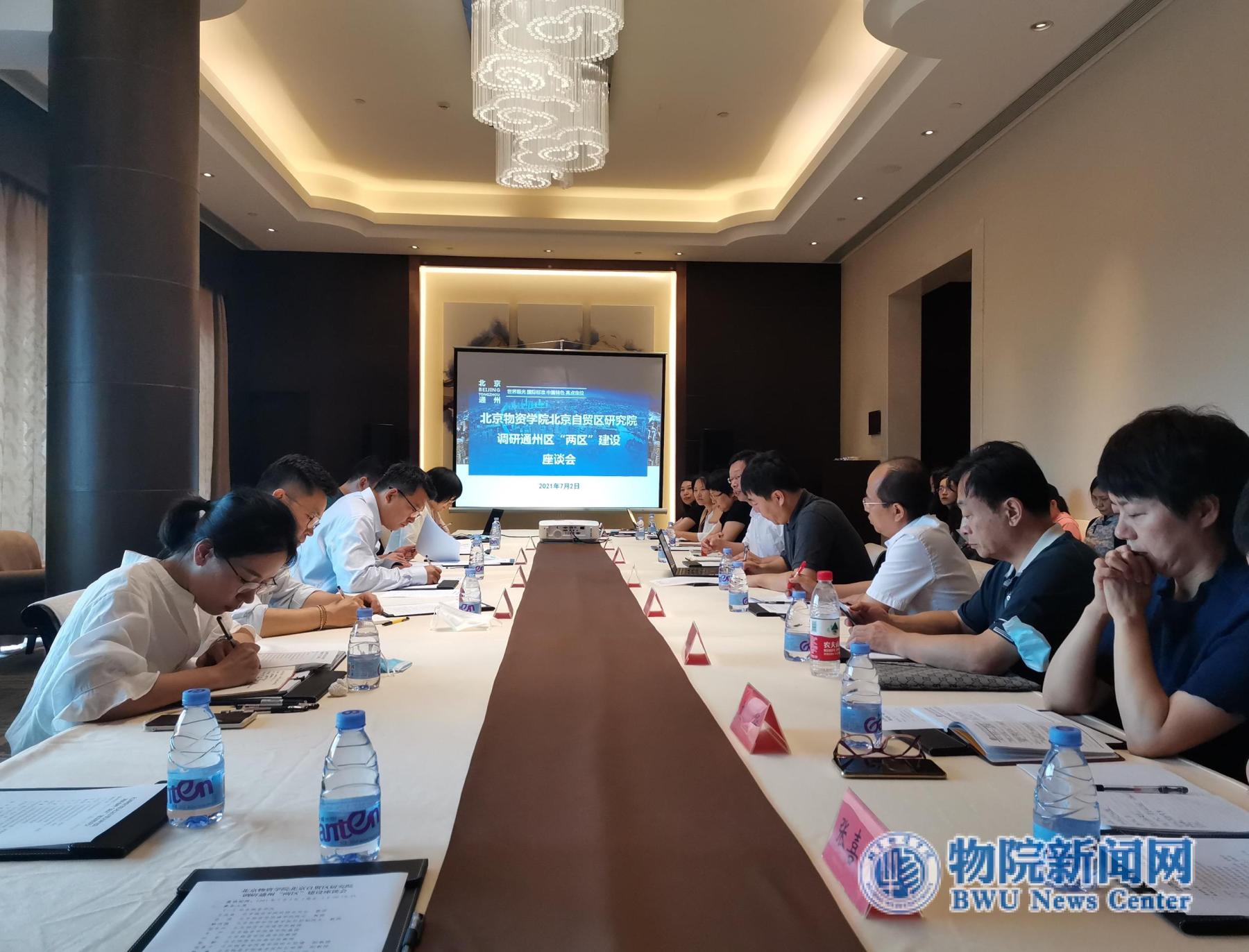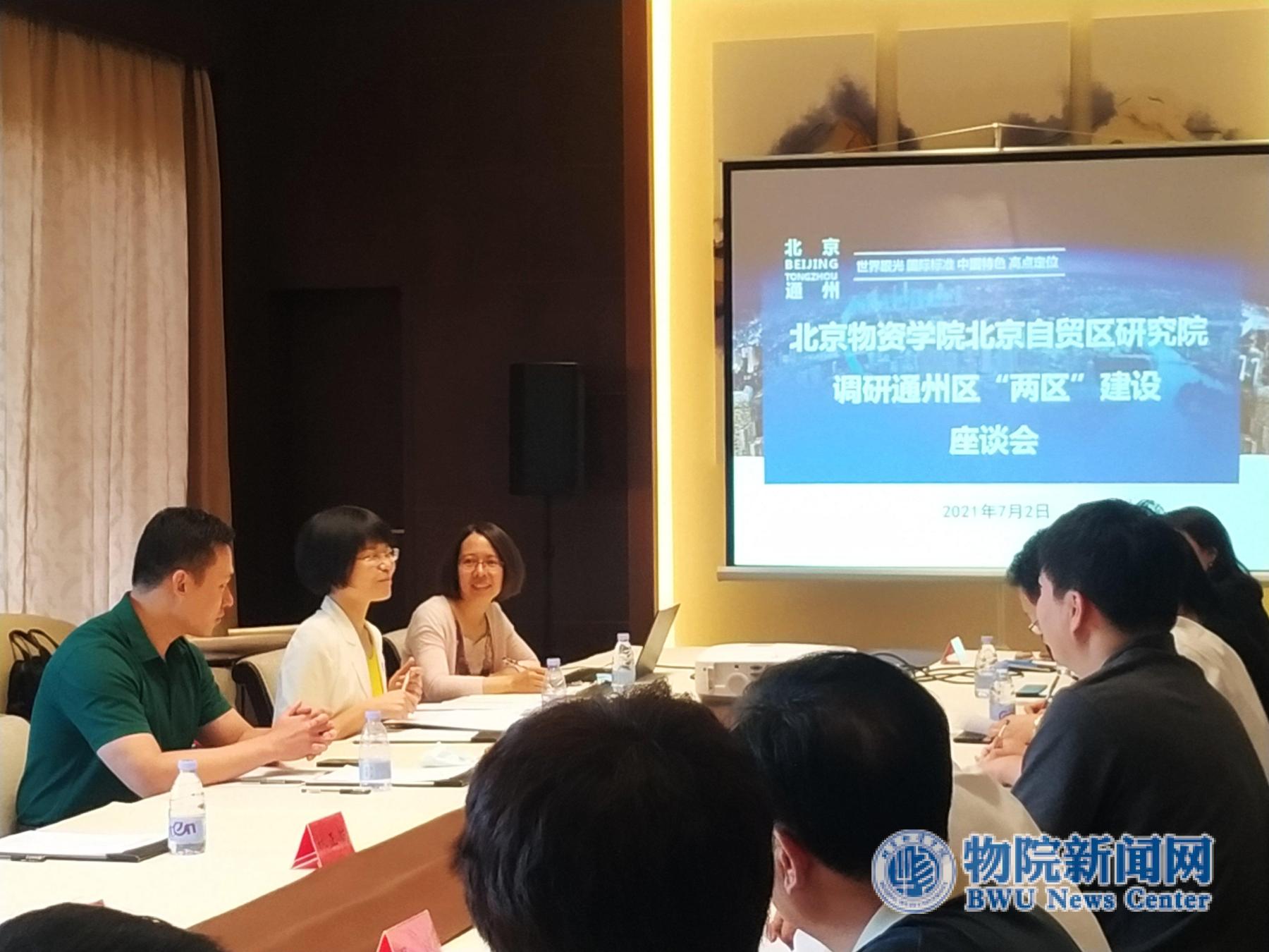 参观结束后,学校调研团队一行同通州区两区办负责同志进行了座谈交流。车欣薇副主任详细介绍了副中心两区建设背景、工作机制、取得的成就及当前的工作安排。科研处处长王成林教授结合学校十四五规划从学校顶层设计的角度介绍了学校对自贸区建设工作的总体规划,包括设立专门指南科研项目深入研究两区建设关键问题,培育专门的团队聚焦该领域进行深入研究,积极推动包括自贸区研究院等高水平科研平台的建设,同时积极推动教师和学生通过挂职锻炼、专业实践等方式参与通州区两区建设,参加通州区的服贸会专题活动,并希望以两区办为平台,积极对接入区企业,开展科学研究、企业培训、学生就业等多方面的合作。