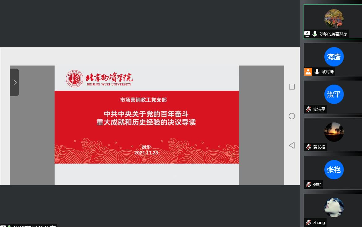 2021年11月23日下午,市场营销教工党支部以在线会议的形式集中开展了《中共中央关于党的百年奋斗重大成就和历史经验的决议》(以下简称《决议》)的学习,会议由市场营销教工党支部书记欧海鹰主持。