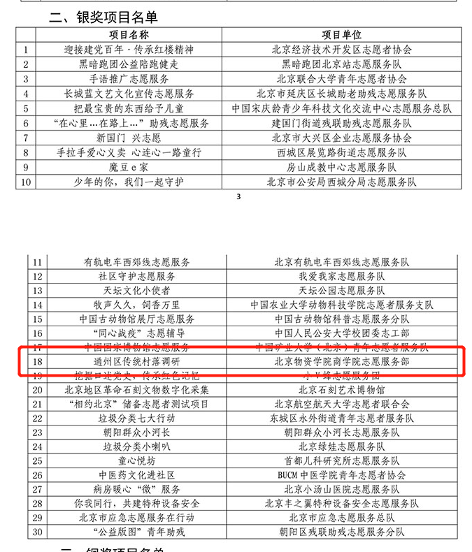 志愿服务部“通州区传统村落调研”项目小组报名参赛,撰写项目书,准备通州区初赛文字资料。5月,小组成员参与专项培训,有针对性地优化了项目书并通过审核,进入通州区复赛。6月16日,项目小组通过通州区复赛路演答辩,进入北京市复赛。经过3个月的资料审核,大赛组委会择优选出全市范围内150个志愿服务项目进入北京市决赛,并于10月国庆期间进行了为期一周的大众评审线上投票。10月17日,项目小组参与决赛路演答辩,以扎实的项目书和清晰的PPT展示赢得评委的关注与好评。10月25日,首都志愿服务项目大赛组委会公布获奖名单,授予“通州区传统村落调研”项目“2021年首都志愿服务项目大赛银奖”。