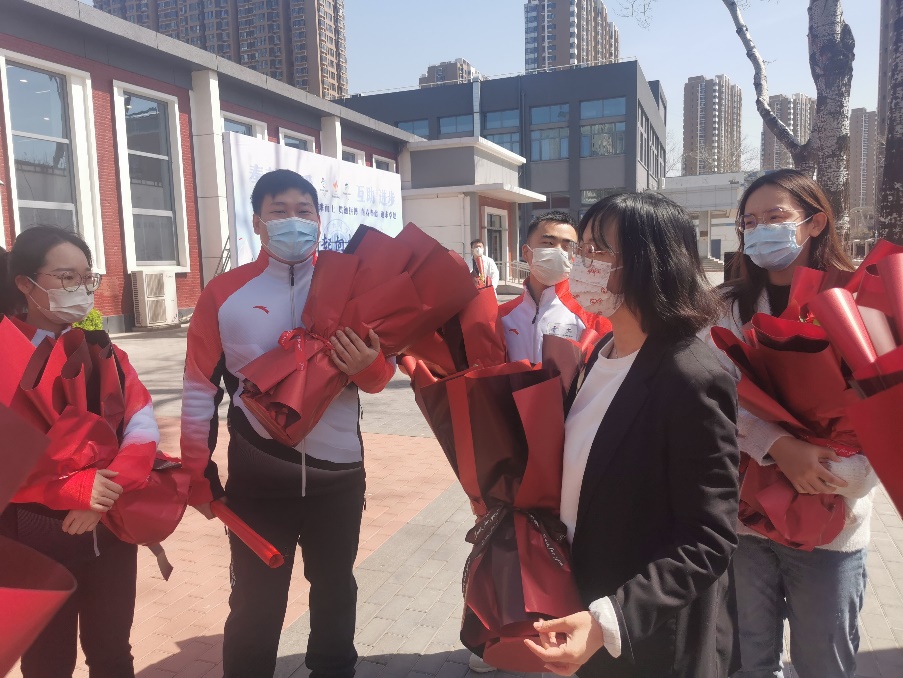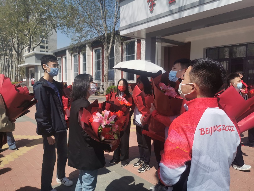 党委副书记陈霄英,分团委书记杨柳依依,辅导员董海辰、陈昕等师生代表热情迎接志愿者们凯旋而归,为志愿者们送上鲜花表示慰问和鼓励。