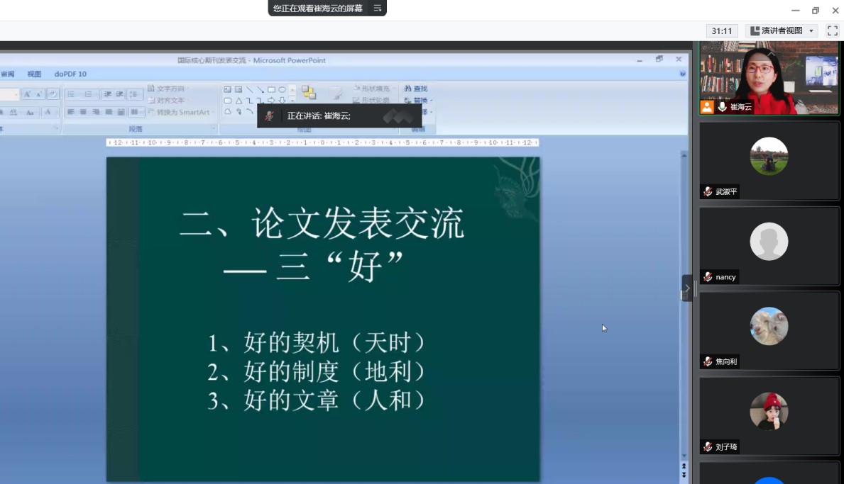 讲座上,崔老师首先从SCI期刊角度出发,对科瑞唯安JCR和中科院的不同SCI期刊分区进行简要介绍;并提出了论文发表的“三好”,即好的契机,好的制度,好的文章。崔老师重点分享了“发表高水平国际期刊文章的十点建议”,主要包括加强合作、关注交叉学科的杂志及论文是否符合期刊风格等关键内容。