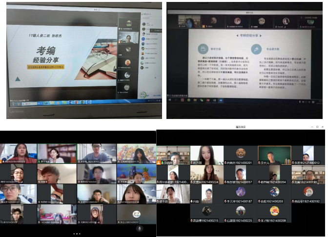 为了给大三准备考研考公的学生以指导,人资专业19级的班主任老师分别邀请今年考研上岸的同学和优秀的校友,以班为单位,开展相关考研、考公等分享会,围绕着学习、工作目标的选择、学习方法与人生规划的制定等展开了交流,老师和学长们也针对同学们提出的问题,做了详尽的解答。老师们鼓励大家在疫情期间也不要放松学习,和老师们多沟通交流,虽然不在学校,但老师的陪伴一直都在。