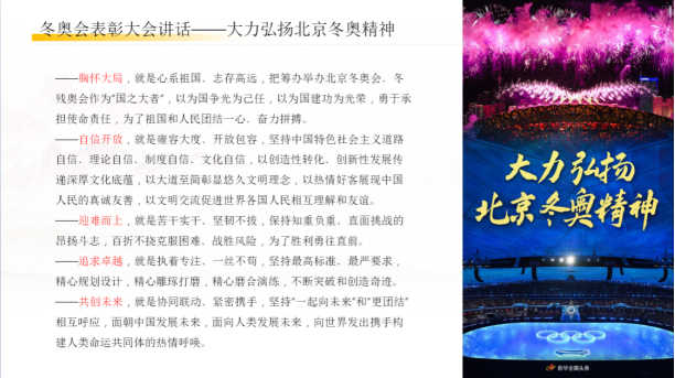 接下来,对于筹办本次冬奥会留下的丰厚的精神财富,郭思源同志对坚持党的集中统一领导、坚持集中力量办大事、坚持主动防范应对各项风险挑战、坚持办赛和服务人民、促进发展相结合四点进行深入讲解。并总结了北京冬奥精神——胸怀大局、自信开放、迎难而上、追求卓越、共创未来,阐述其中内涵并作简要分析。