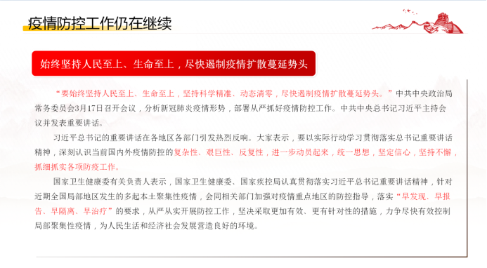 理论学习会第一项,针对《习近平总书记关于疫情防控工作的重要讲话》,李文曦同志就习近平总书记的讲话内容,讲解了新冠肺炎疫情形势,以及部署从严抓好疫情防控工作的相关条例,应“始终坚持人民至上、生命至上,坚持科学精准、动态清零,尽快遏制疫情扩散蔓延势头。”各企业单位要以实际行动学习贯彻落实总书记重要讲话精神,深刻认识当前国内外疫情防控的复杂性、艰巨性、反复性,进一步动员起来,统一思想,坚定信心,坚持不懈,抓细抓实各项防疫工作。