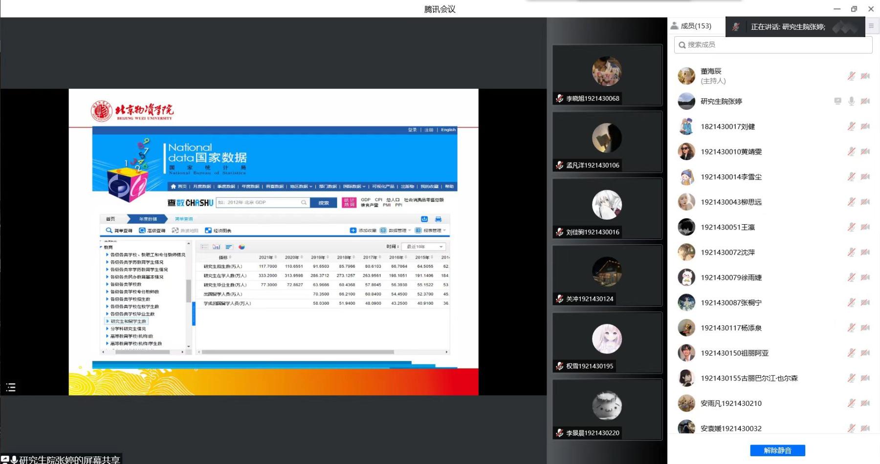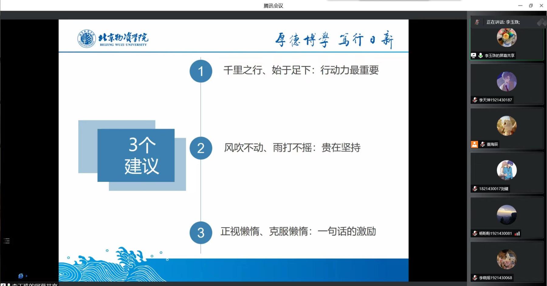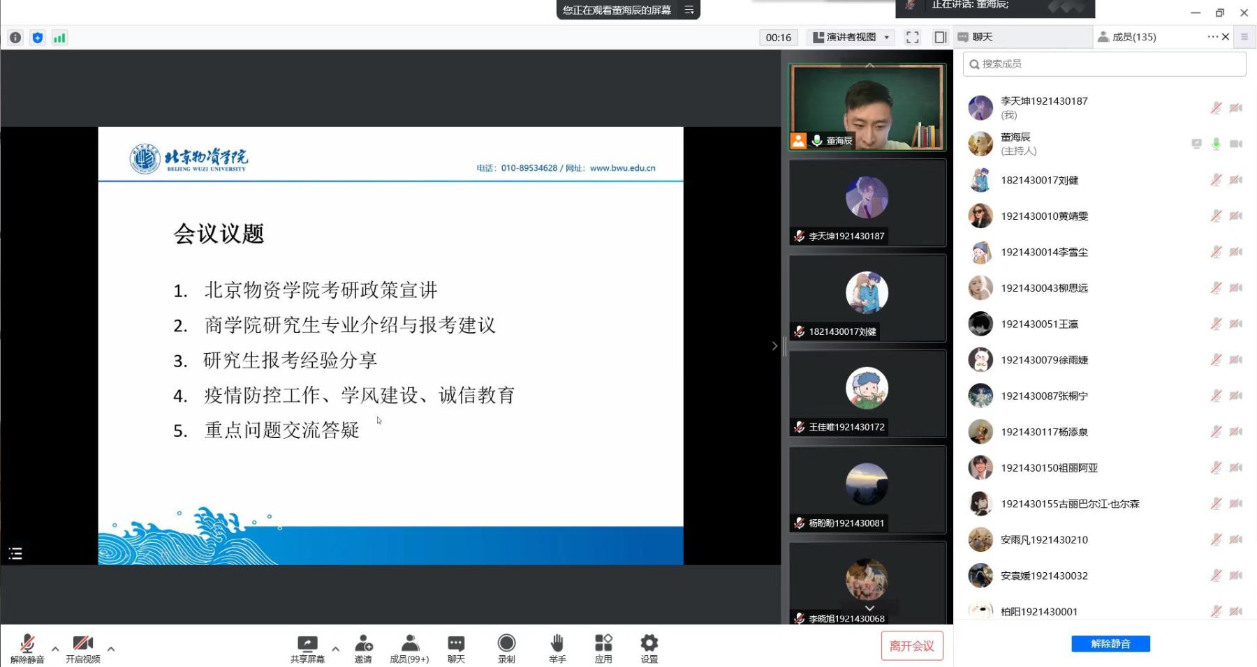 最后,董海辰老师就以上三位老师和同学的发言进行了总结,再次强调了考研选择的重要性。并从信息获取、考研难度方面总结了报考建议。随后,老师对疫情防控与要求进行了讲解。并从近期疫情防控的案例进行了解读,告诉大家引以为戒,指出疫情防控不是儿戏,必须认真严肃对待,同时强调了每日健康打卡的重要性。接着老师就学习与学风建设、《学生手册》解读以及考试作弊诚信违规等事项进行了解读并提出了要求,号召大家诚信考试,不要作弊。