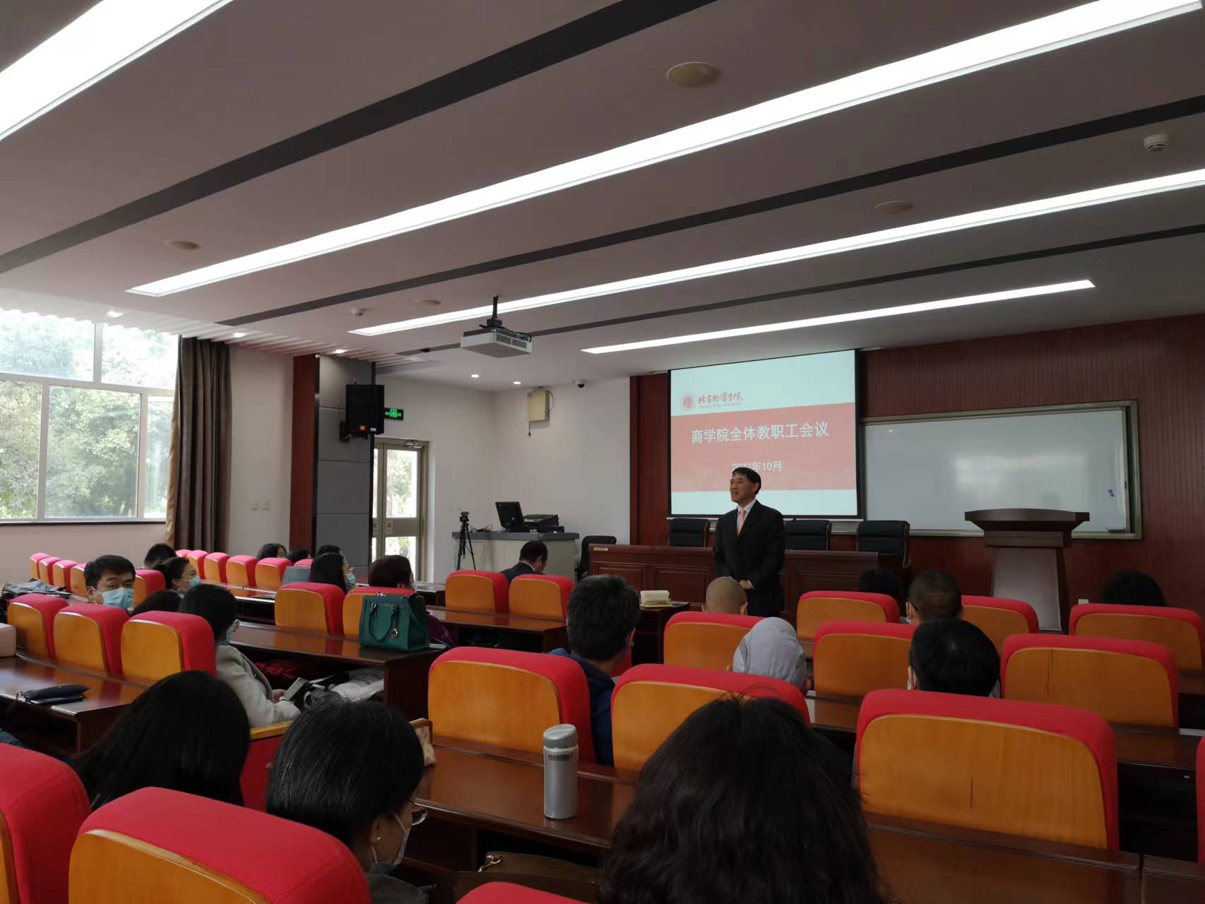 领导班子及全院教职工参加会议。会上,党委副书记陈霄英介绍了近期学生工作及疫情防控要求等事宜;教学副院长李燕荣就近期教学重点工作进行安排与部署;院长助理李玉珠就召开国际会议、研究生工作等内容进行了说明。