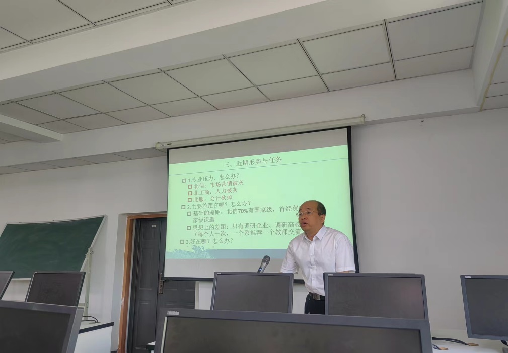 吕波院长总结肯定了本学期专业转型和访企拓岗等工作的调研成果,指出了学院专业转型的主要形势与任务,强调全体教职工要主动了解政策,转变思想观念、形成好的团队,有好的工作作风,积极推进学院专业转型升级。