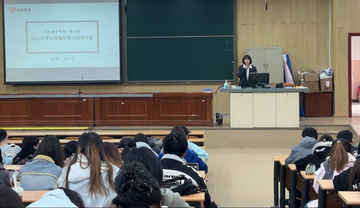 特邀考公指导教师傅叶红从宏观形势、数据分析、学习计划等方面进行了系统讲解。傅老师结合当前公务员、事业单位招录形势:报考人数持续增加、岗位竞争压力加大,考试内容更加注重政治素养、阅读写作能力和逻辑思维能力等新特点,并围绕考试时间、报名流程、岗位分数、区域差异等内容进行了详细解读,帮助同学们更加清晰地认识当前就业竞争态势,进一步明确备考方向和学习重点。
