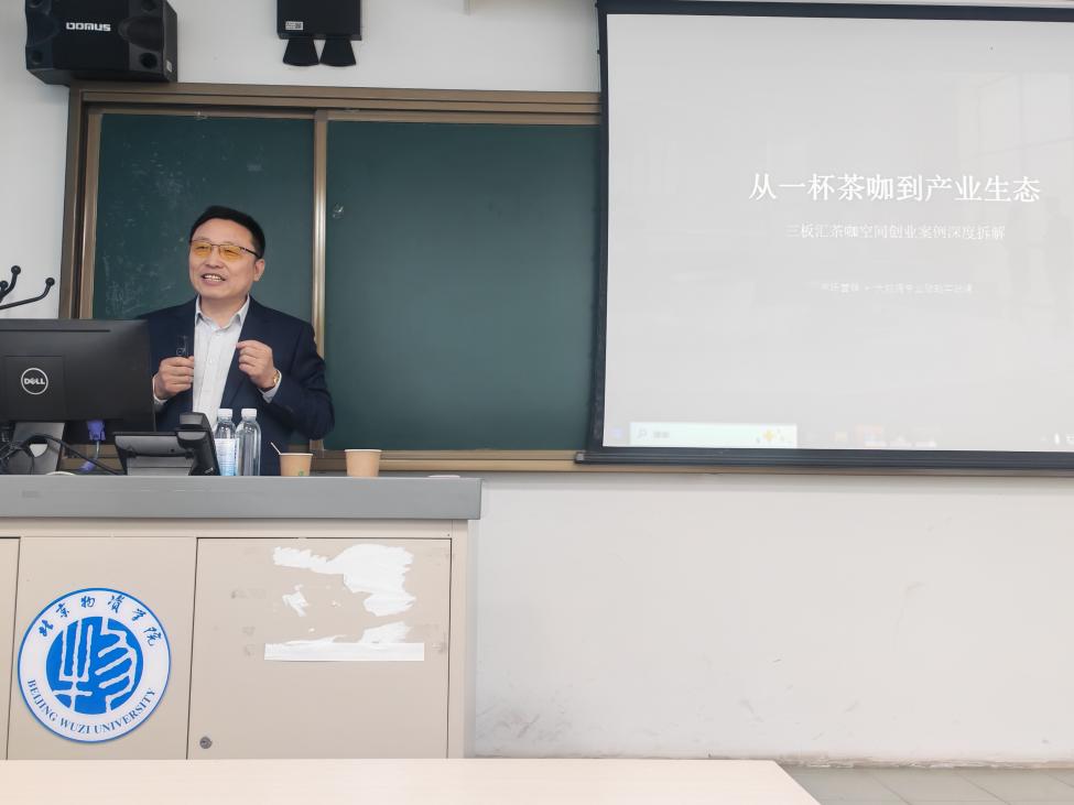 随后,李浩先生走进《市场营销学》课堂,以《从一杯茶咖到产业生态——三板汇茶咖空间创业案例深度拆解》为题,为师生呈现了一堂理论与实践深度融合的案例教学课。作为曾参与新三板、北交所相关政策制定,并辅导逾500家企业登陆资本市场的资深金融专家,李浩先生结合自身二十余年行业深耕经验,系统复盘了三板汇茶咖空间从0到1起步、从1到N扩张的完整商业演进路径。
